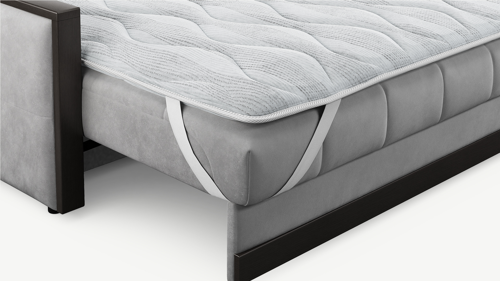 Топпер можно использовать как на диване, так и на матрасе. Фиксация на поверхности спального места осуществляется с помощью широких резинок в четырех угловых точках.