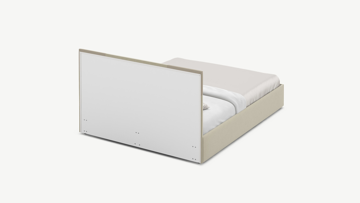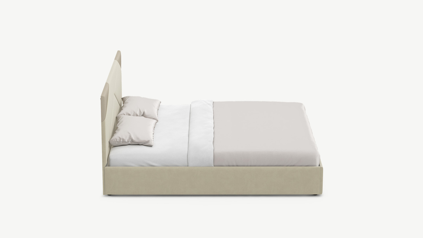 MOON FAMILY 1257 привлекает внимание оригинальным исполнением: широкие полосы ткани эффектно пересекают периметр изголовья, создавая на нем графический орнамент. Лаконичные формы объемных царг создают единый гармоничный образ и фокусируют внимание на центральном текстурном элементе кровати.