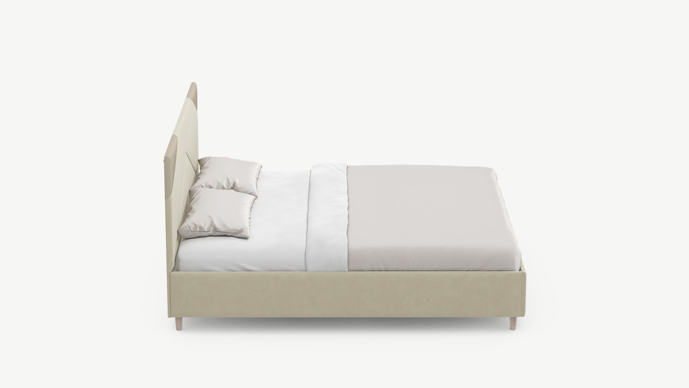MOON FAMILY 1257 привлекает внимание оригинальным исполнением: широкие полосы ткани эффектно пересекают периметр изголовья, создавая на нем графический орнамент. Лаконичные формы объемных царг создают единый гармоничный образ и фокусируют внимание на центральном текстурном элементе кровати.