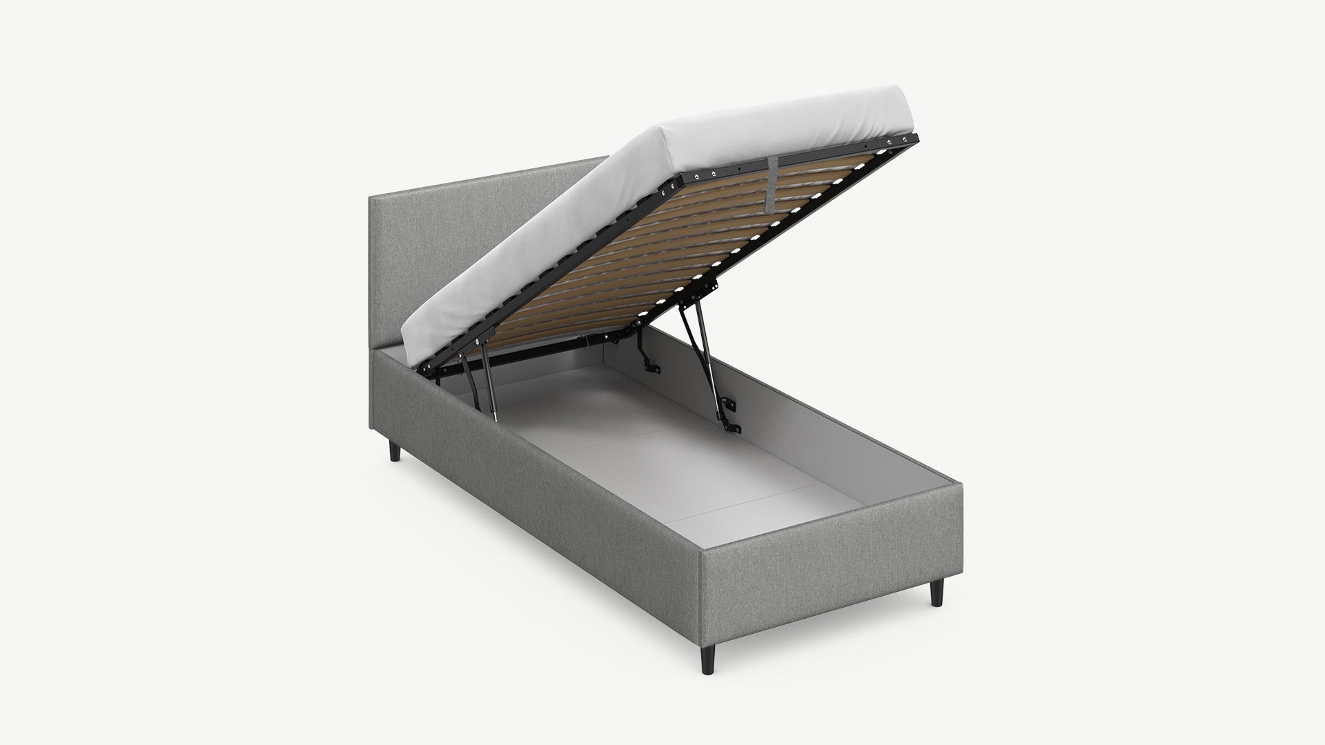 - Регулируемый подъемный механизм имеет два положения установки газовых амортизаторов в зависимости от веса матраса. Это дает возможность оптимально подстраивать угол подъема основания, а также плавно и бесшумно поднимать и опускать спальное место.