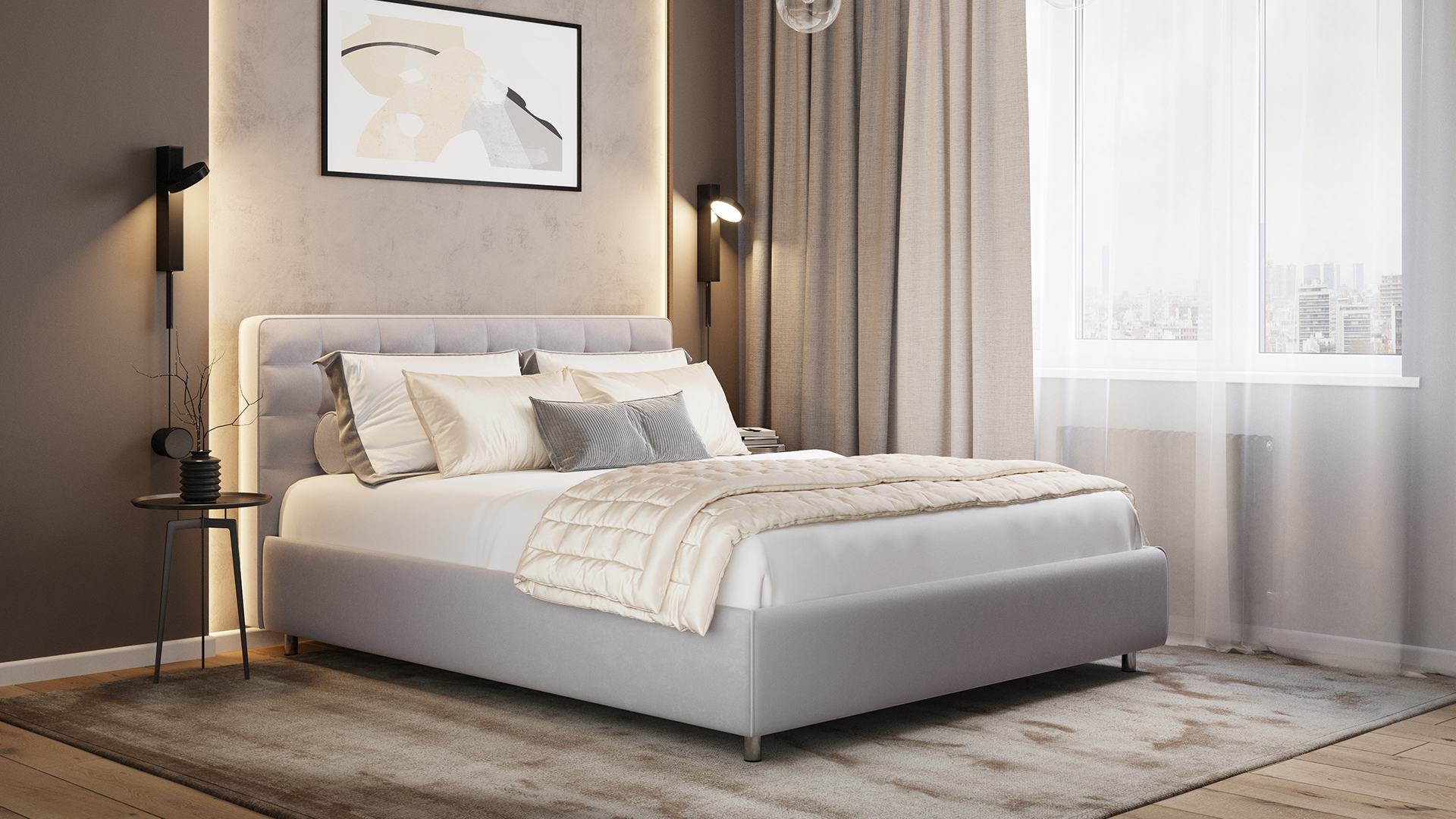 Кровать MOON 1165 привлекает внимание объемным мягким изголовьем и массивными царгами. Глубокая утяжка добавляет этому дизайну благородного шарма. Кант, пропущенный по линиям MOON 1165, формирует изысканный силуэт.