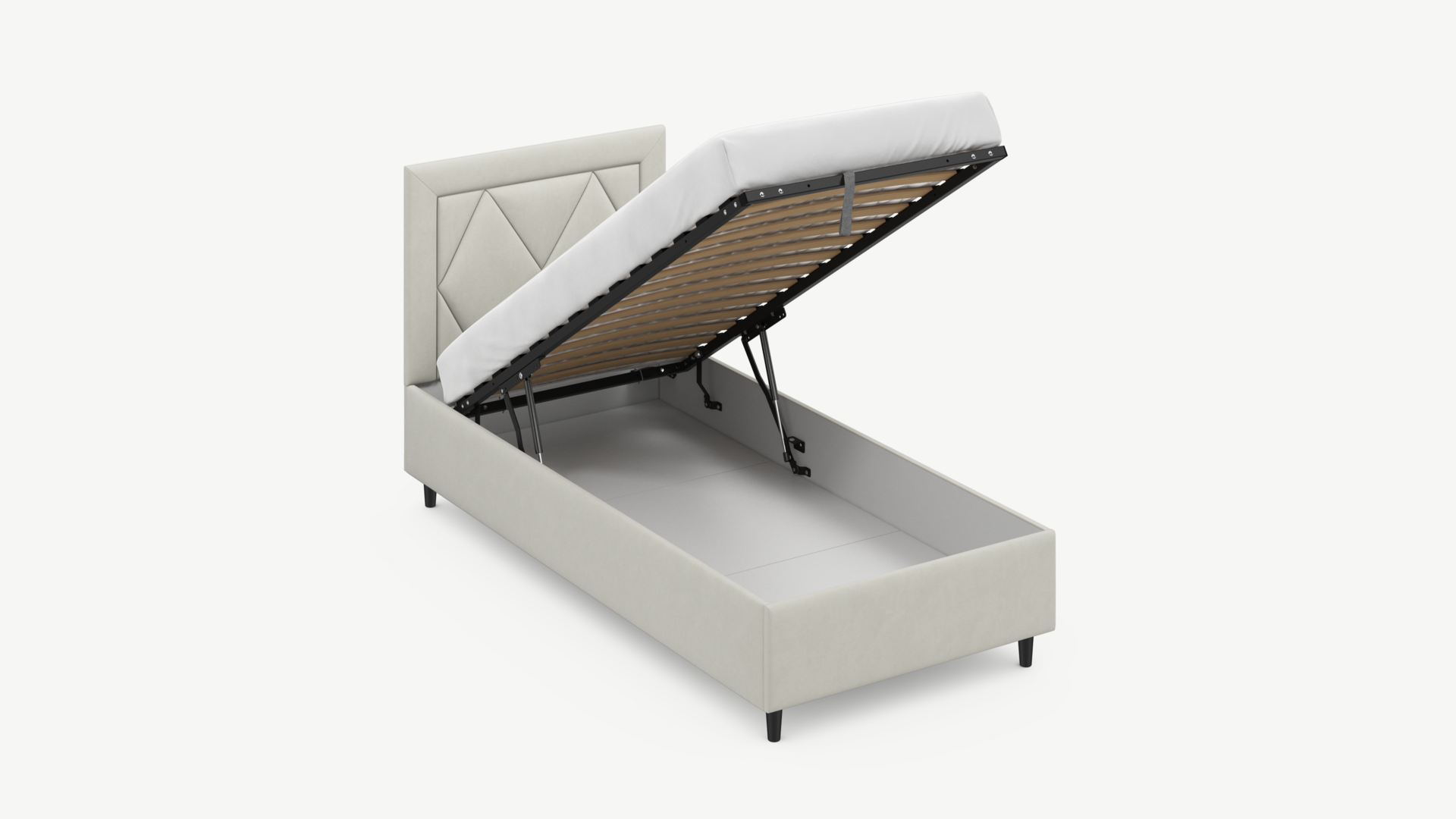• Скрытая под основанием вместительная емкость без внутренних перегородок позволяет использовать всю площадь подкроватного пространства для хранения вещей.