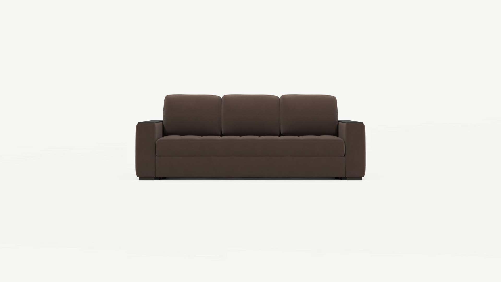 По замыслу дизайнеров, форма подушек удачно поддерживается объемными прямоугольными подлокотниками с широкой столешницей, на которую всегда можно положить книгу и пульт, телефон или планшет, а также поставить чашечку чая.