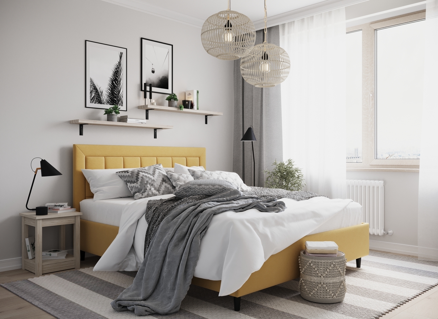 Создать гармоничный интерьер и завершить образ спальни помогут дополнительные аксессуары, например: тумбы, банкетки, подушки.