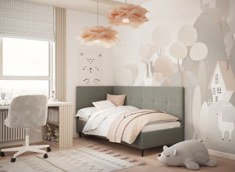Кровать угловая с подъемным механизмомУгловая односпальная кровать MOON FAMILY 1261 с мягкой спинкой и изголовьем создаст в Вашей спальне ощущение уюта. Крупная квадратная стежка привносит в интерьер графических акцентов, а вставка из пуговиц наполняет пространство ощущением домашнего тепла.