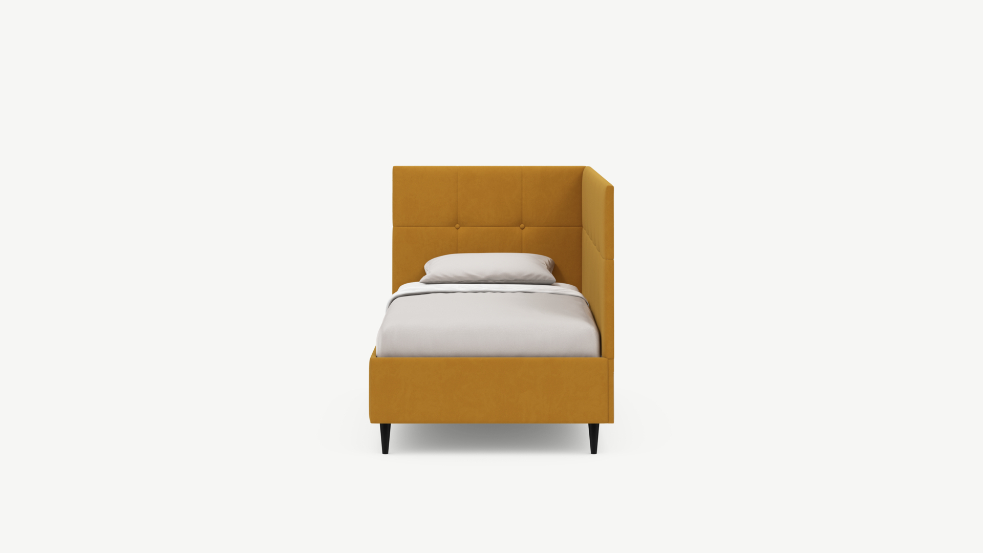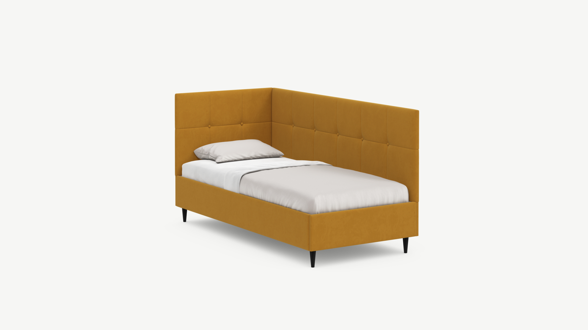 Угловая односпальная кровать MOON FAMILY 1261 с мягкой спинкой и изголовьем создаст в Вашей спальне ощущение уюта. Крупная квадратная стежка привносит в интерьер графических акцентов, а вставка из пуговиц наполняет пространство ощущением домашнего тепла.