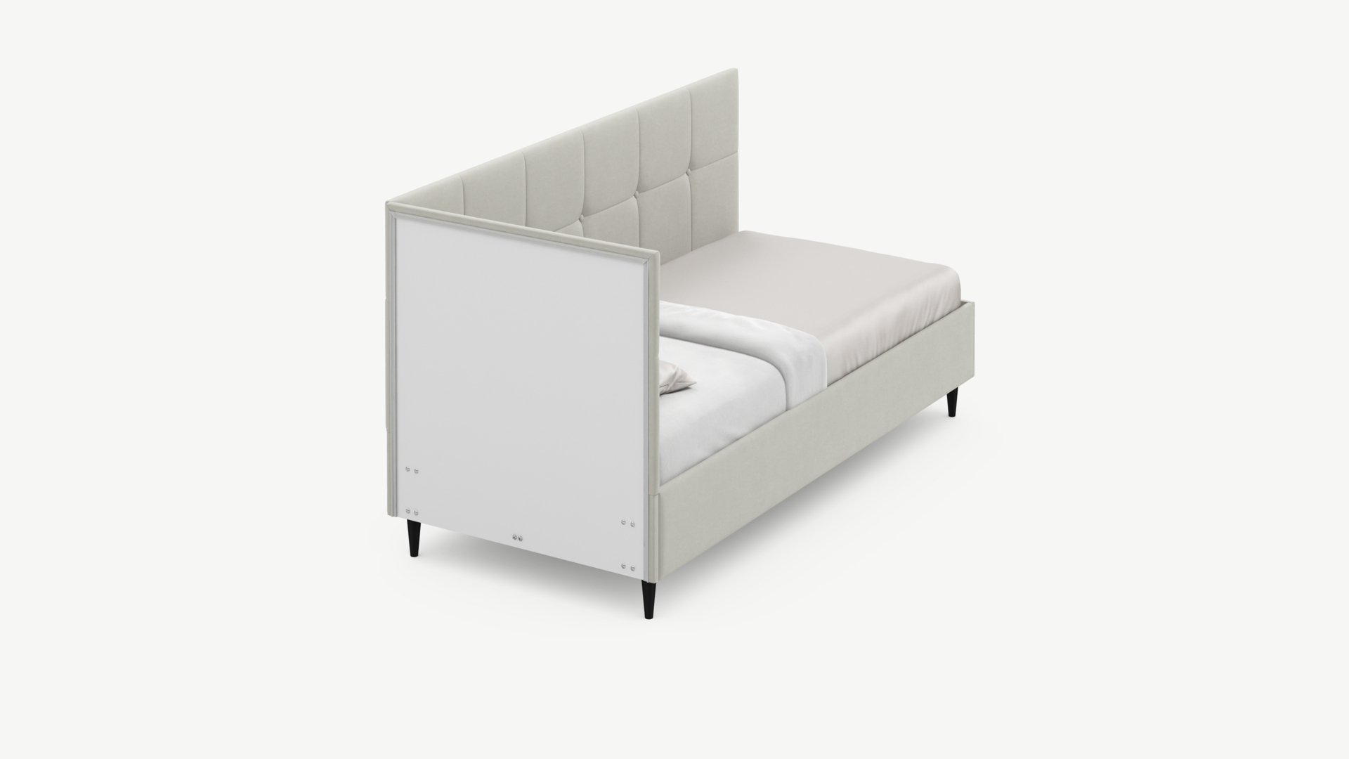 Угловая односпальная кровать MOON FAMILY 1261 с мягкой спинкой и изголовьем создаст в Вашей спальне ощущение уюта. Крупная квадратная стежка привносит в интерьер графических акцентов, а вставка из пуговиц наполняет пространство ощущением домашнего тепла.