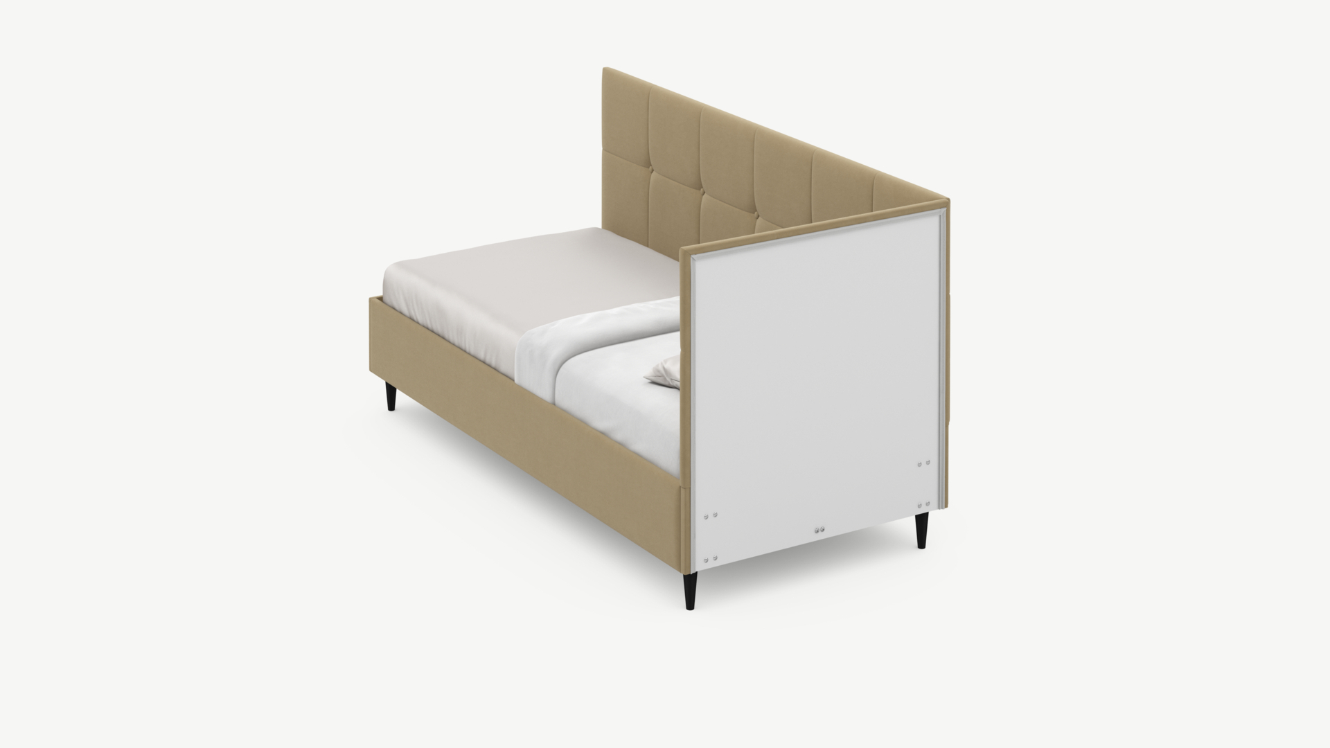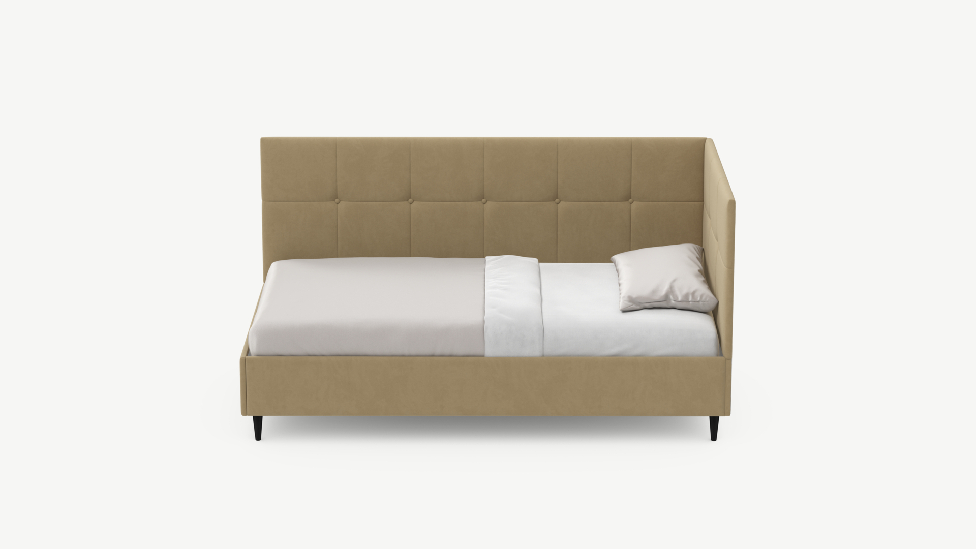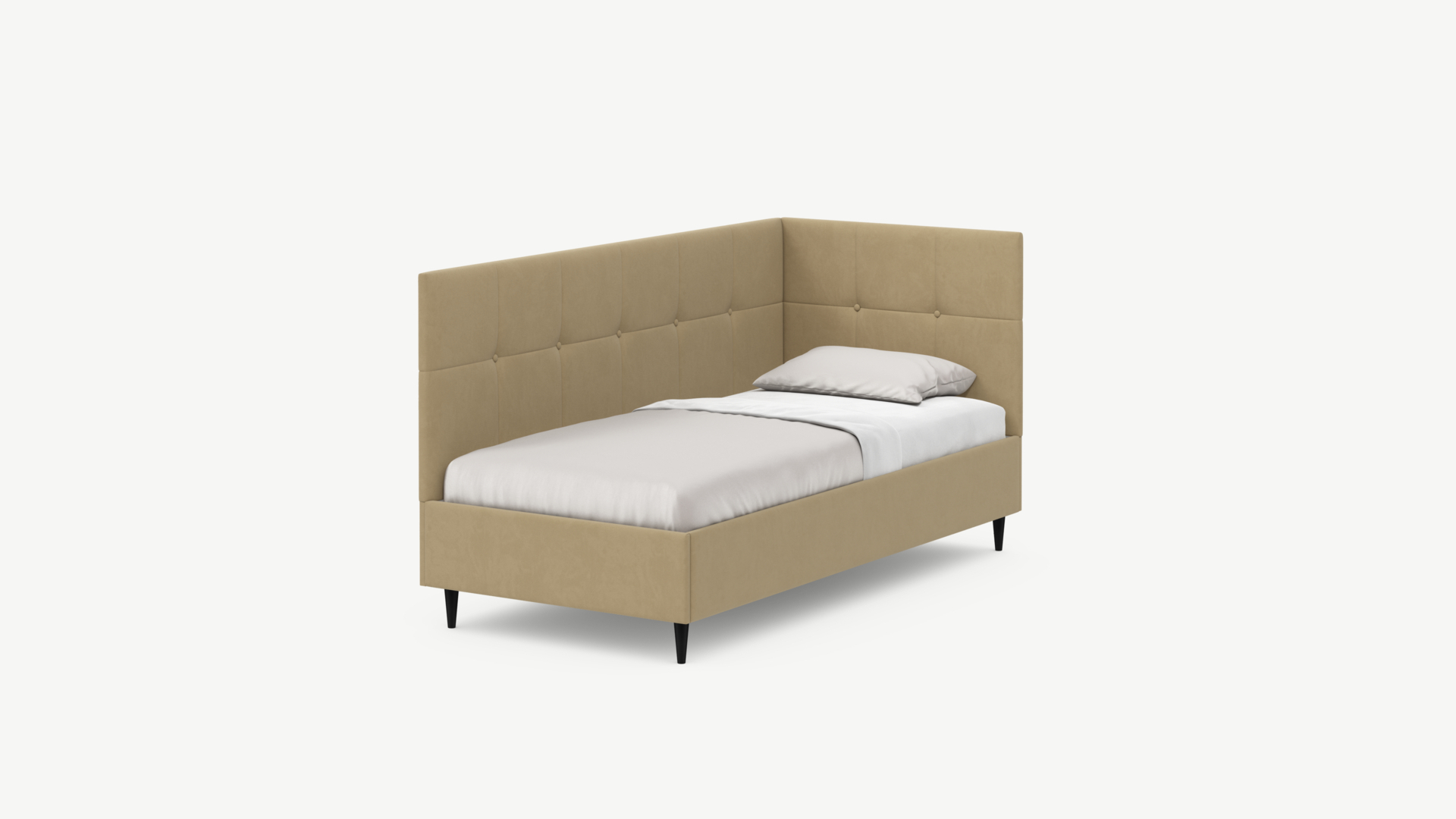 Угловая односпальная кровать MOON FAMILY 1261 с мягкой спинкой и изголовьем создаст в Вашей спальне ощущение уюта. Крупная квадратная стежка привносит в интерьер графических акцентов, а вставка из пуговиц наполняет пространство ощущением домашнего тепла.