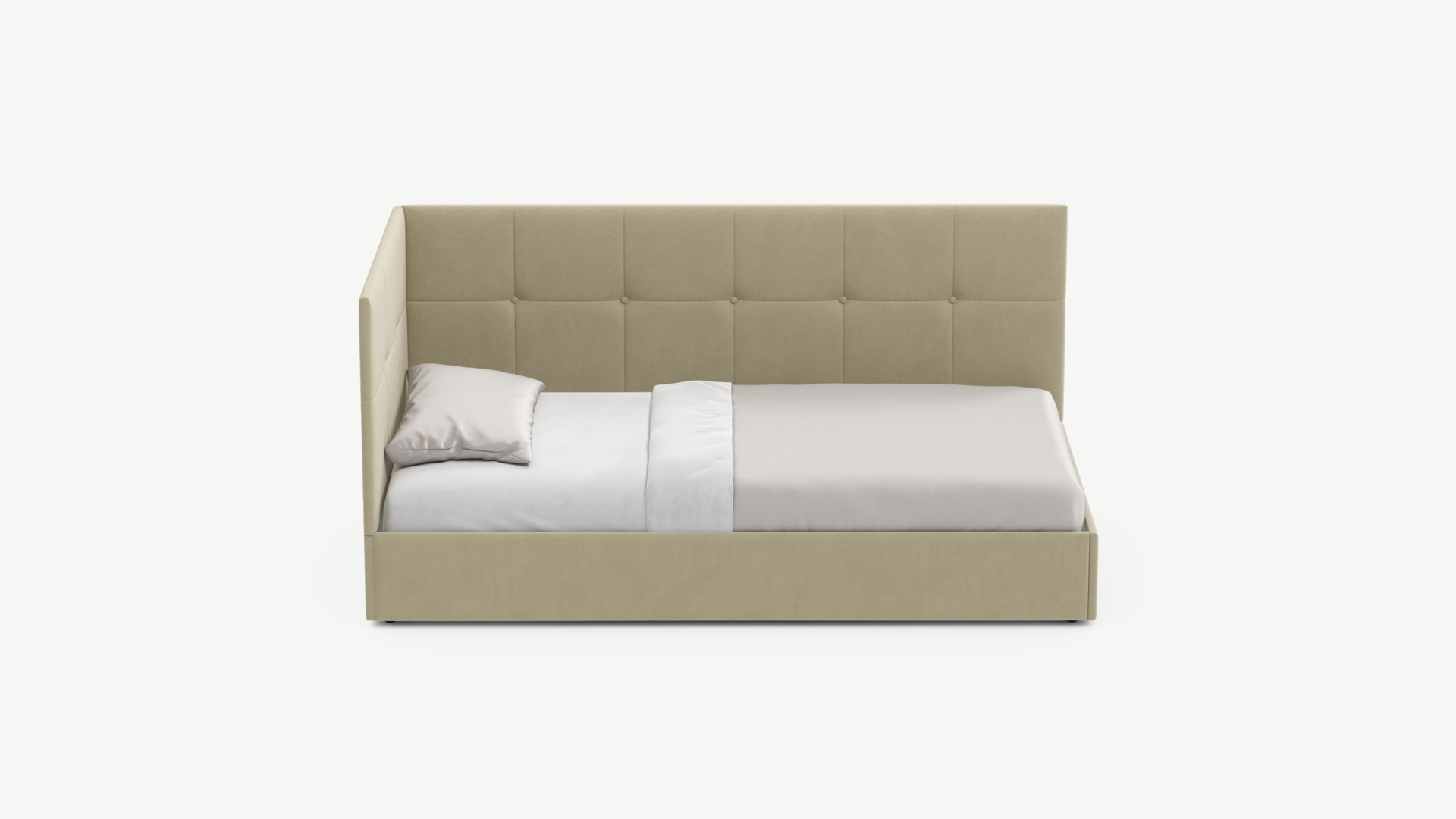 Угловая односпальная кровать MOON FAMILY 1261 с мягкой спинкой и изголовьем создаст в Вашей спальне ощущение уюта. Крупная квадратная стежка привносит в интерьер графических акцентов, а вставка из пуговиц наполняет пространство ощущением домашнего тепла.