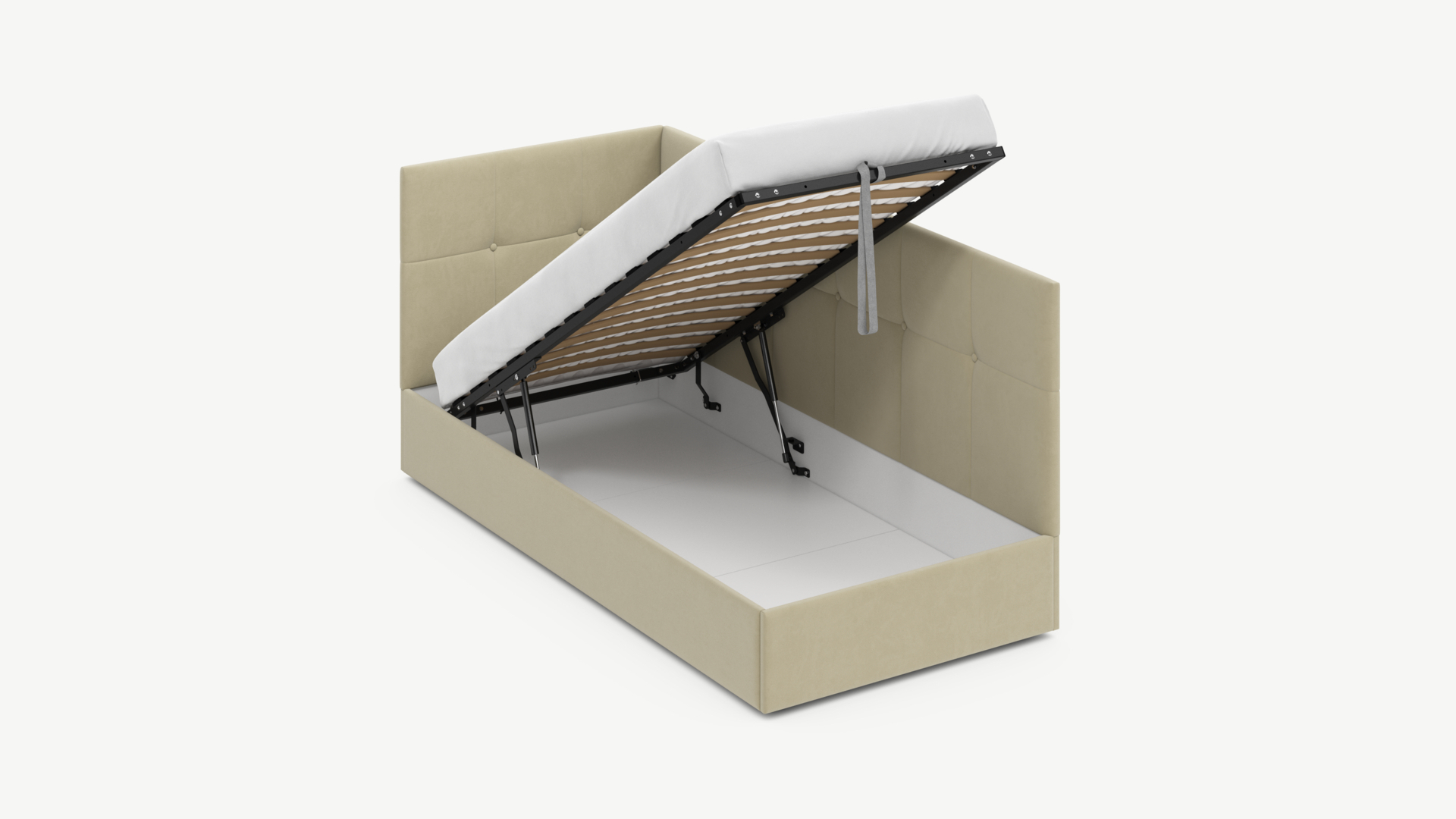 • Скрытая под основанием вместительная емкость без внутренних перегородок позволяет использовать всю площадь подкроватного пространства для хранения вещей.
