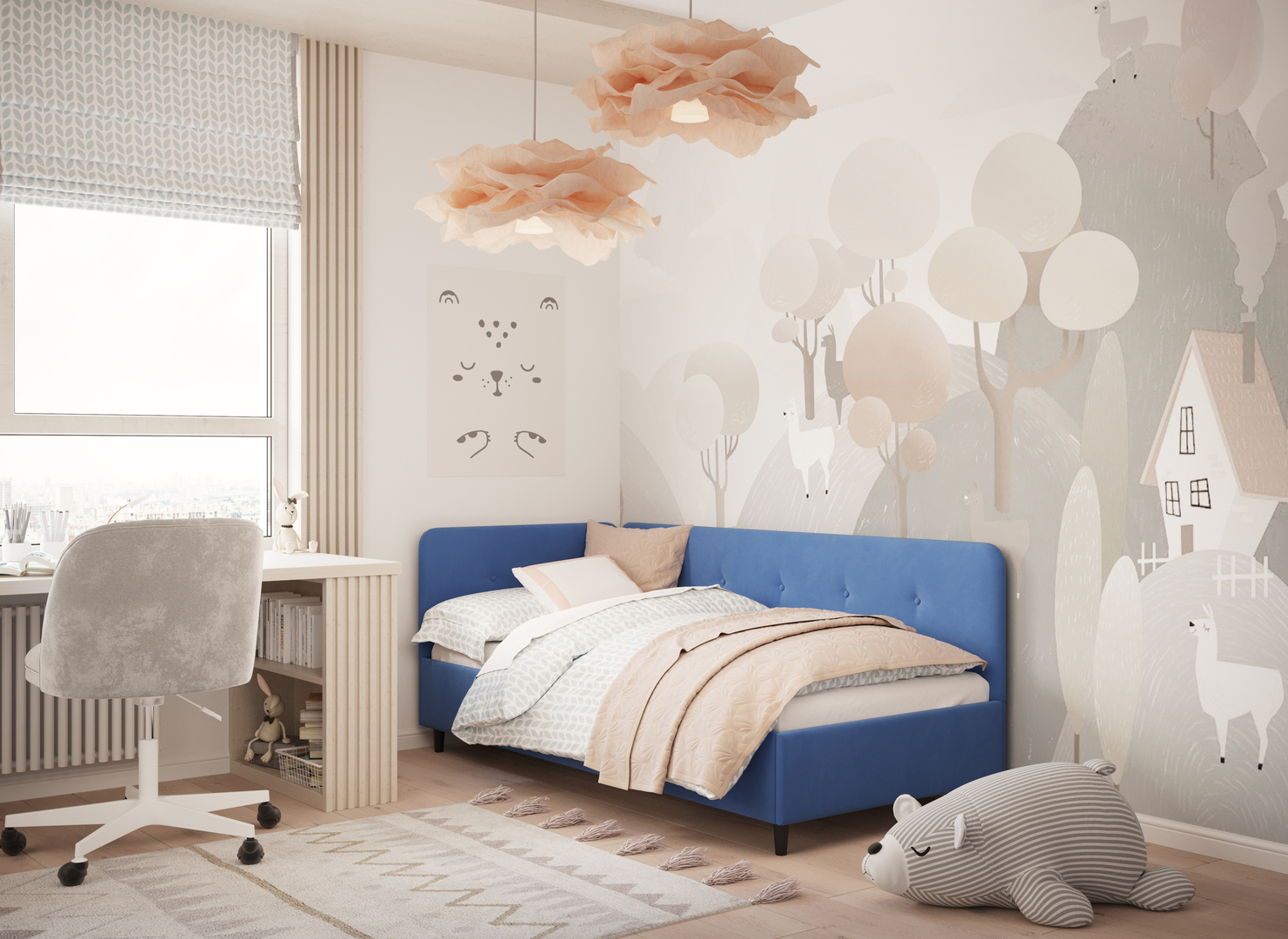 Угловая односпальная кровать MOON FAMILY 1253 с мягкой спинкой и изголовьем обладает округлыми формами, привносящими в интерьер нотки нежности. Изголовье, украшенное пуговицами, добавляет окружающему пространству шарм и уют. Высокие опоры придают кровати визуальной легкости, а также обеспечивают удобство во время уборки.