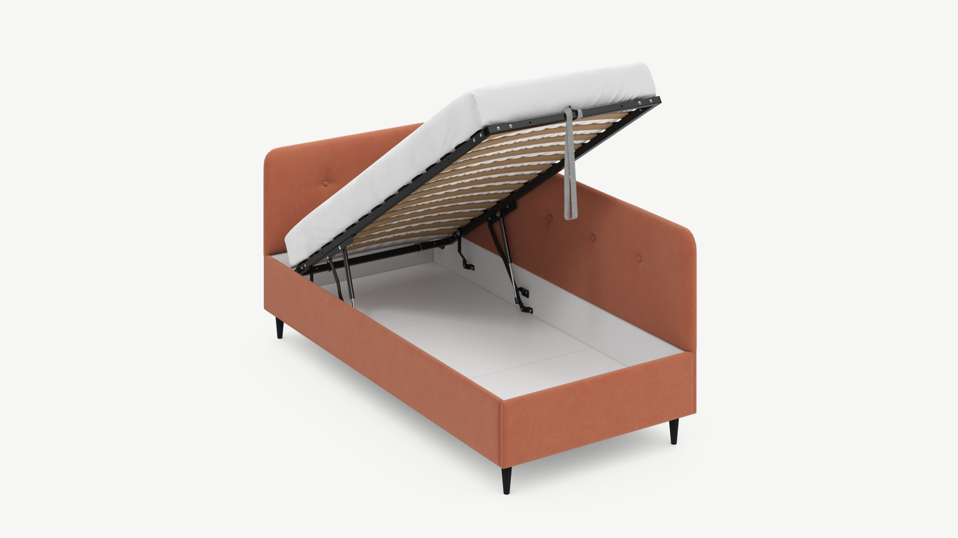 • Скрытая под основанием вместительная емкость без внутренних перегородок позволяет использовать всю площадь подкроватного пространства для хранения вещей.