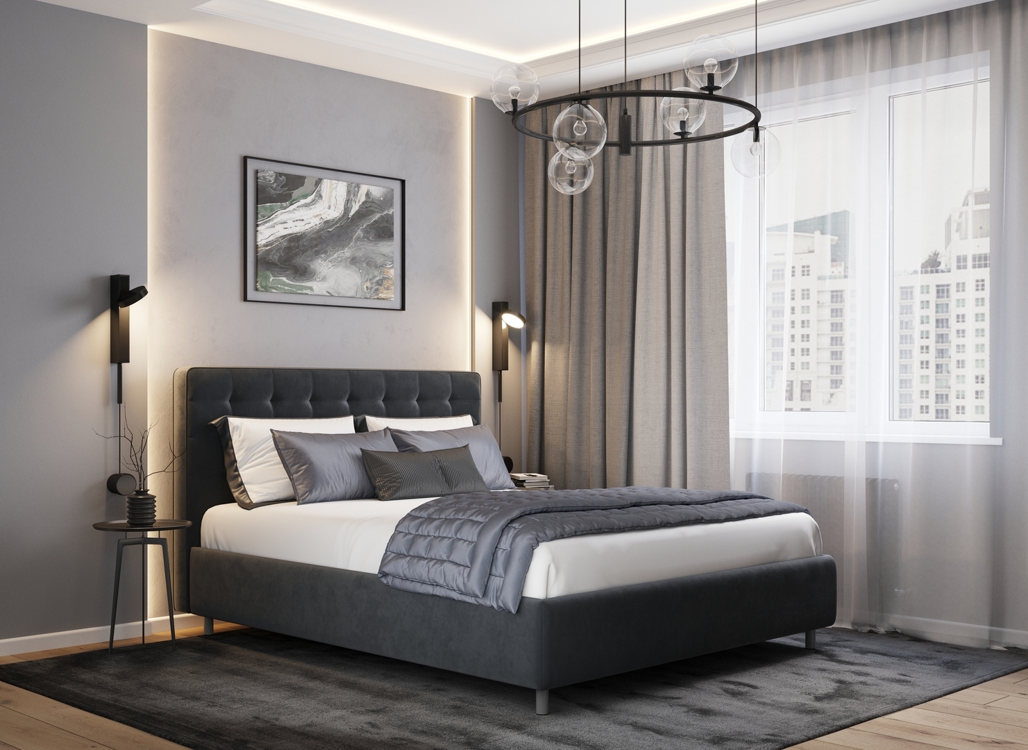 Обратная сторона изголовья выполнена в мебельной ткани и позволяет ставить кровать в центре комнаты для зонирования пространства.