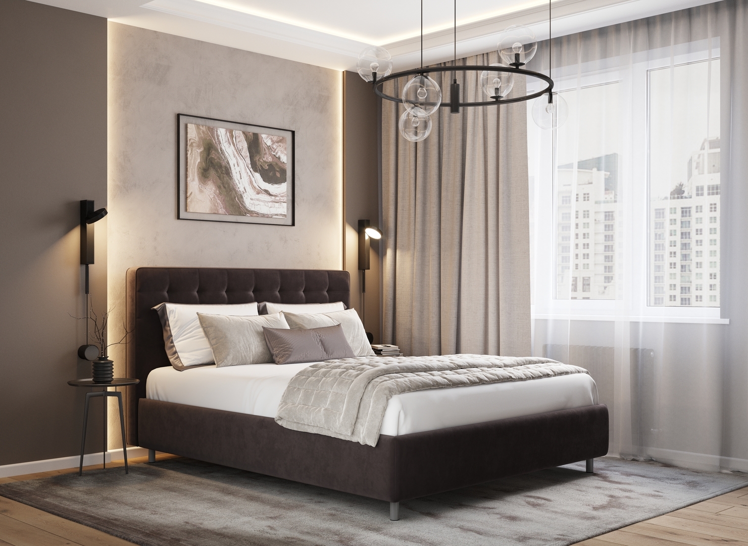 Творчески завершить образ спальни помогут дополнительные аксессуары: например, декоративные подушки-валики MOON 1165, прикроватные тумбы, банкетки, а также покрывала-саше.
