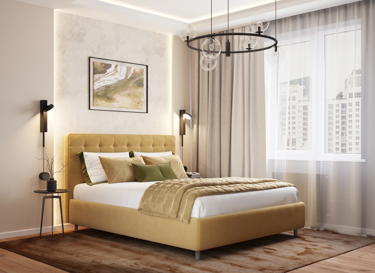 Оформите образ кровати, выбирая обивочный материал, который подчеркнет звучание Вашей спальни и отразит Ваш вкус. Обратите внимание на однотонный гладкий велюр, который усиливает объемную фактуру стежки.